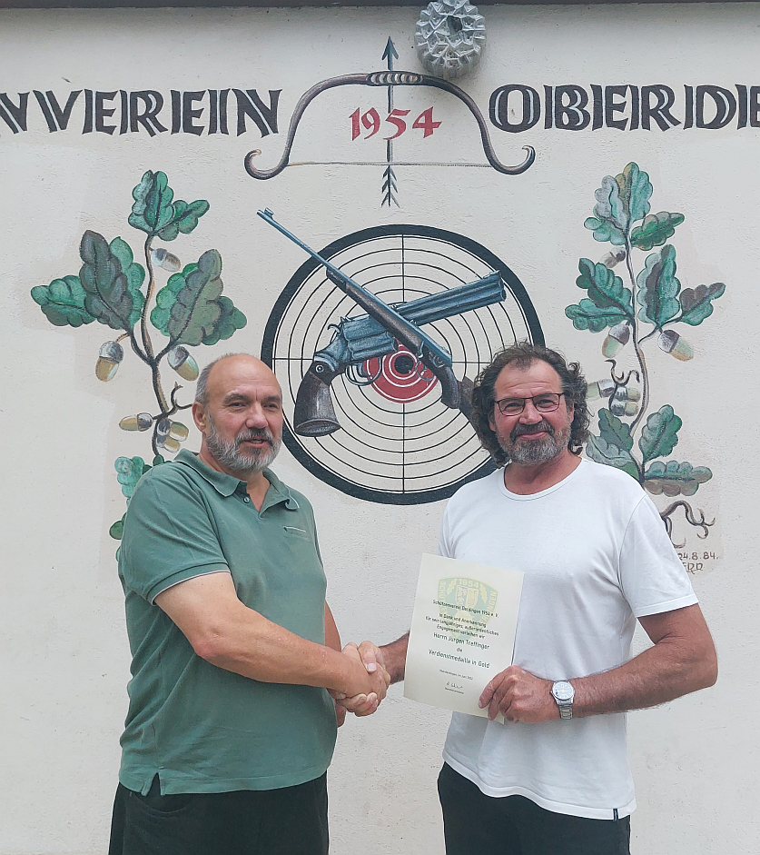 Am 24.06.2022 begrüßte der 1. Vorstand Harald Weisert ab 19 Uhr 52 anwesende Mitglieder zur Jahresversammlung des SV Derdingen 1954 auf dem Hagenrain. Er nahm bei dieser Gelegenheit hochverdiente Ehrungen vor. Mehrere langjährige Mitglieder des SV wurden vom Württembergischen Schützenverband für ihre Treue zum Schießsport mit Urkunden und Ehrennadeln ausgezeichnet, manche davon sogar für 50 Jahre Zugehörigkeit. Für sein Wirken als Oberschützenmeister über 12 Jahre mit unzähligen Arbeitsstunden für die Verwaltung des Vereins, die Umsetzung wechselnder Rechtsvorschriften, die stete Modernisierung der Schießstände und nicht zuletzt die Organisation der ersten beiden Coronajahre im SV Derdingen 1954 erhielt Jürgen Treffinger in der Generalversammlung unter großem Applaus die Verdienstmedaille in Gold (s. Photo).